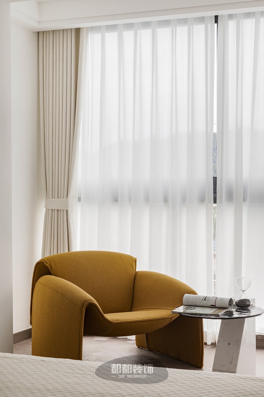 在阳光的影响下,米色的空间有着透气的呼吸感,即使是纯白的墙看起来也没有单调死板的效果。 整体墙面的大面积留白,让视觉更集中在床头这一块,浅咖色的绒布床头板厚实又舒适,环形水晶吊灯增添轻奢质感。 现在连懒人沙发都开始内卷了吗?亮棕色螃蟹椅流畅的造型和亲肤的面料,让人看到就想体验一把葛优躺的快乐!
