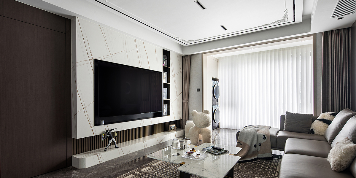 从客厅的落地窗望去白天可远看风景,为空间增添了绿意,客厅设计采用巧克力棕+雪花白的配色、硬朗的空间线条,勾勒出整个客厅空间优雅质感的风骨,屋内宁静沉敛,空间开阔明亮,既有和谐的形制色彩,又有独具意境的艺术品活跃其中。 在电视背景墙处,纯白的岩板上勾勒了许多纵横交错的深咖色条纹,搭配同色系木格栅,让人有种扑面而来的自然质朴气息,这也体现了业主作为新时代都市丽人对自然、本真的追求。 电视柜右侧的开放格上放满了不同色彩的潮玩熊,有透明亚克力盒子的保护就能避免灰尘的污染,靓丽的色彩也会保持的更久。 沙发背景墙明净简洁,咖色纹路自然舒展配合浅棕色软皮沙发,整体空间是对眼睛的一次洗礼,轻重相合,浓淡有致。 自带生机与活力标签的亮黄色装饰画,以童真童趣的笔触铺陈,为空间注入天真浪漫的气息, 羊羔毛小马椅双耳设计,可以当扶手也可以做护栏,圆润可爱的造型一眼就爱上。 阳台门打通后整个视野都开阔了不少,从客厅通铺到阳台的灰色大理石瓷砖,耐脏好打理,阳台装的是可折叠的全景窗,可开可关视觉感超棒,洗漱台洁白纯净,烘干机上墙空间更整洁。
