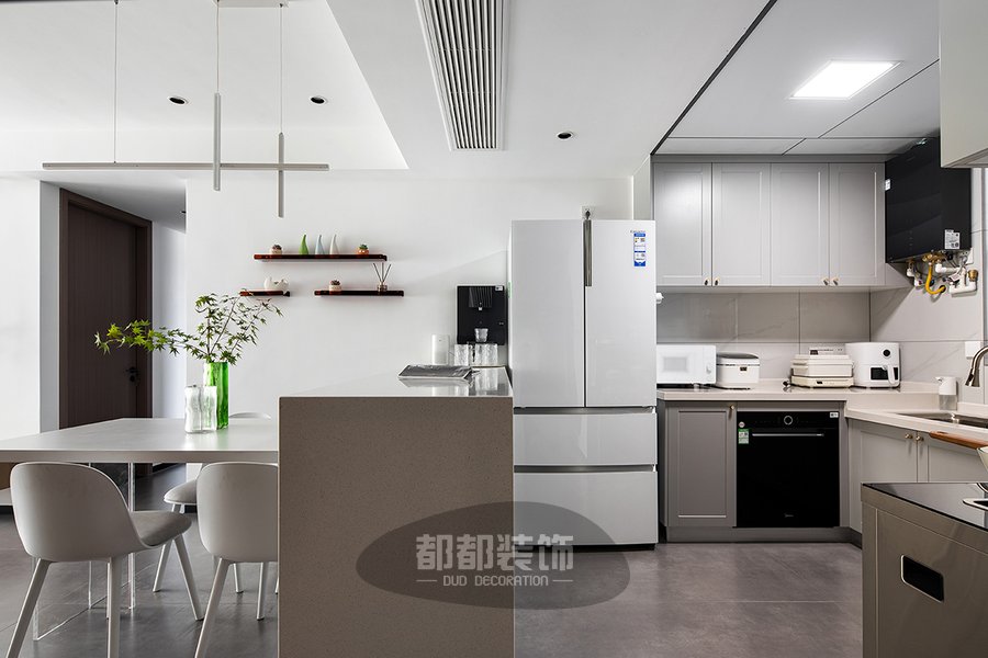 餐厅与客厅在空间上连为一体,却在背景墙和地毯间进行了无形的分割,温温柔柔的白色系软装,打造出一个格调高雅又温馨舒适的用餐空间。 白色桌面+透明亚克力的餐桌,搭配简约软包的餐椅,简约中带了些许烟火气,让用餐时光显得更加惬意享受,长型吊灯视觉上减少了层高,近距离的温馨光线会让美食更加可口! 餐厅空间简单、安静,白色背景墙上安置着三块茶色隔板,点缀一些多肉和小陶艺,ins风十足,素白的餐桌椅搭配翠绿的盆栽,清爽的配色,有序的布局,将生活感与品质感密切结合,给人手可及的安心,将生活与乐趣融进房子里。 胡桃木色的餐边柜采用玻璃门柜+中间镂空+无把手的设计,开放式与封闭式收纳相结合,满足不同的收纳需求,使胡先生的两口生活变得更加悠然自在。