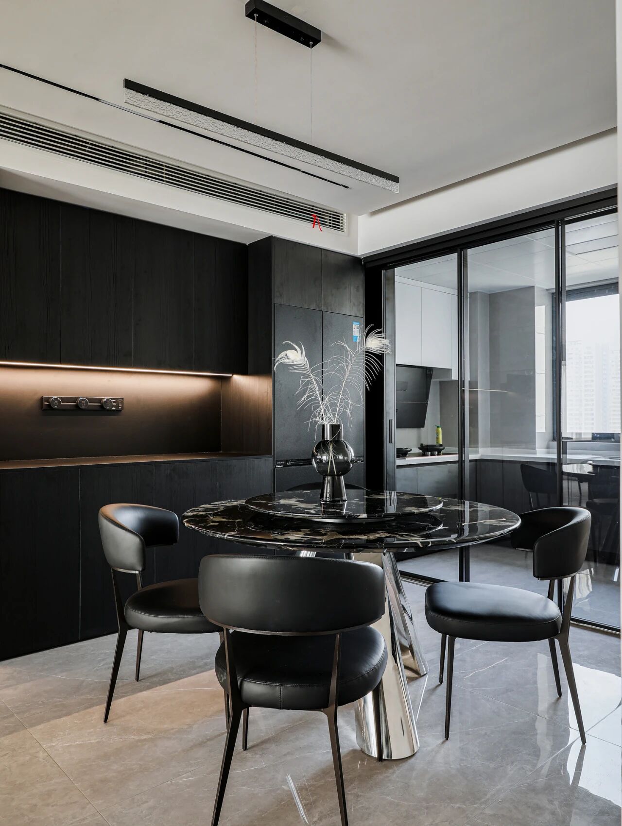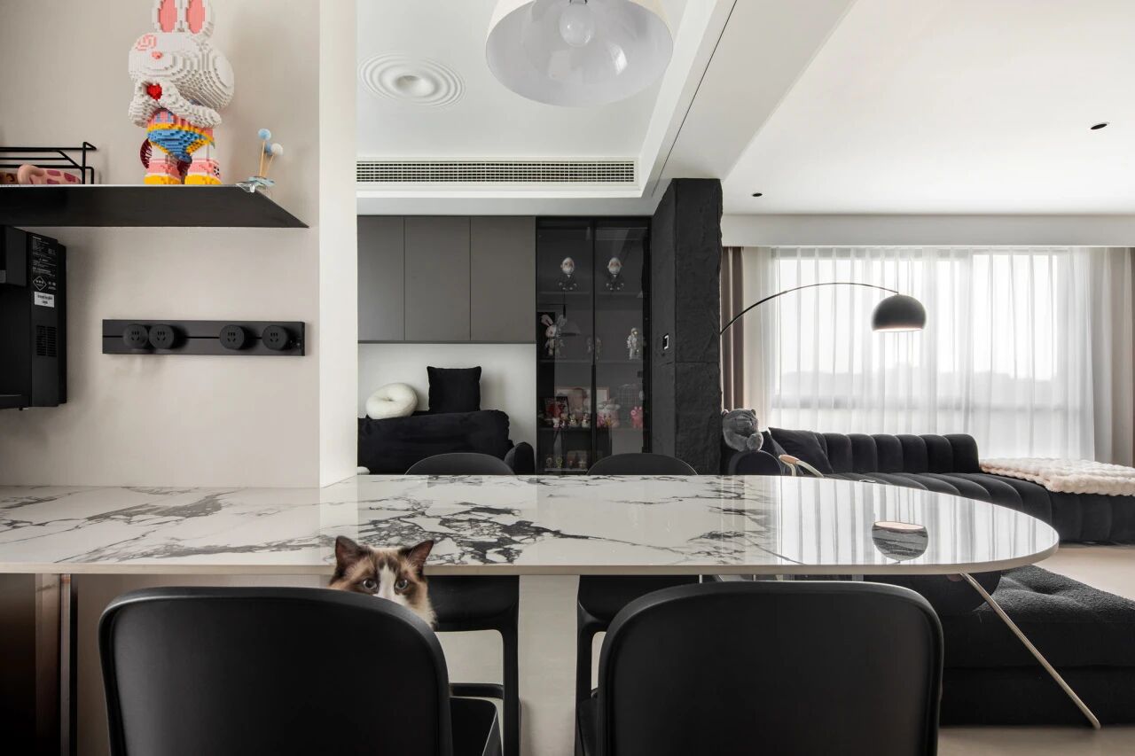 大理石餐桌比较适合现代风、意式风、轻奢风等风格,与皮质餐椅搭配能带给人一种奢华精致感。