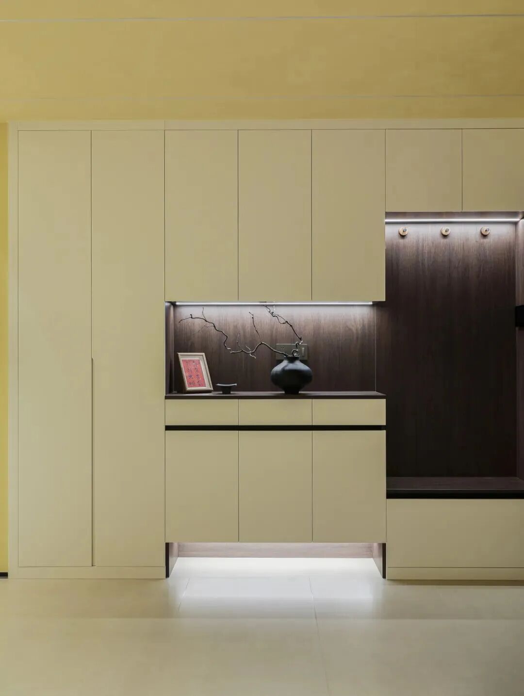 定制玄关柜做一柜到顶,中部留空进门放钥匙手机等小杂物,底部留空放当天换下来的鞋,功能性拉到最大。