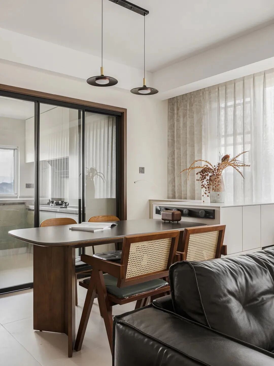 可以选择吊灯作为主灯,吊灯的高度可以根据餐桌的高度进行调整,一般距离餐桌70-80cm 为宜。