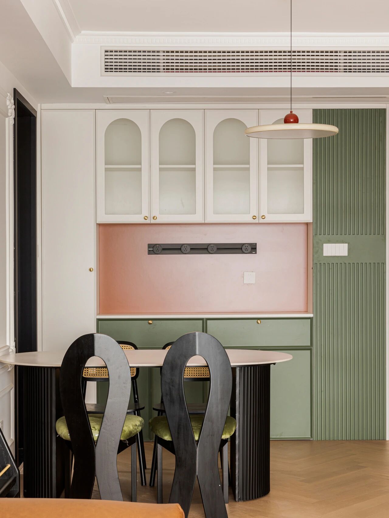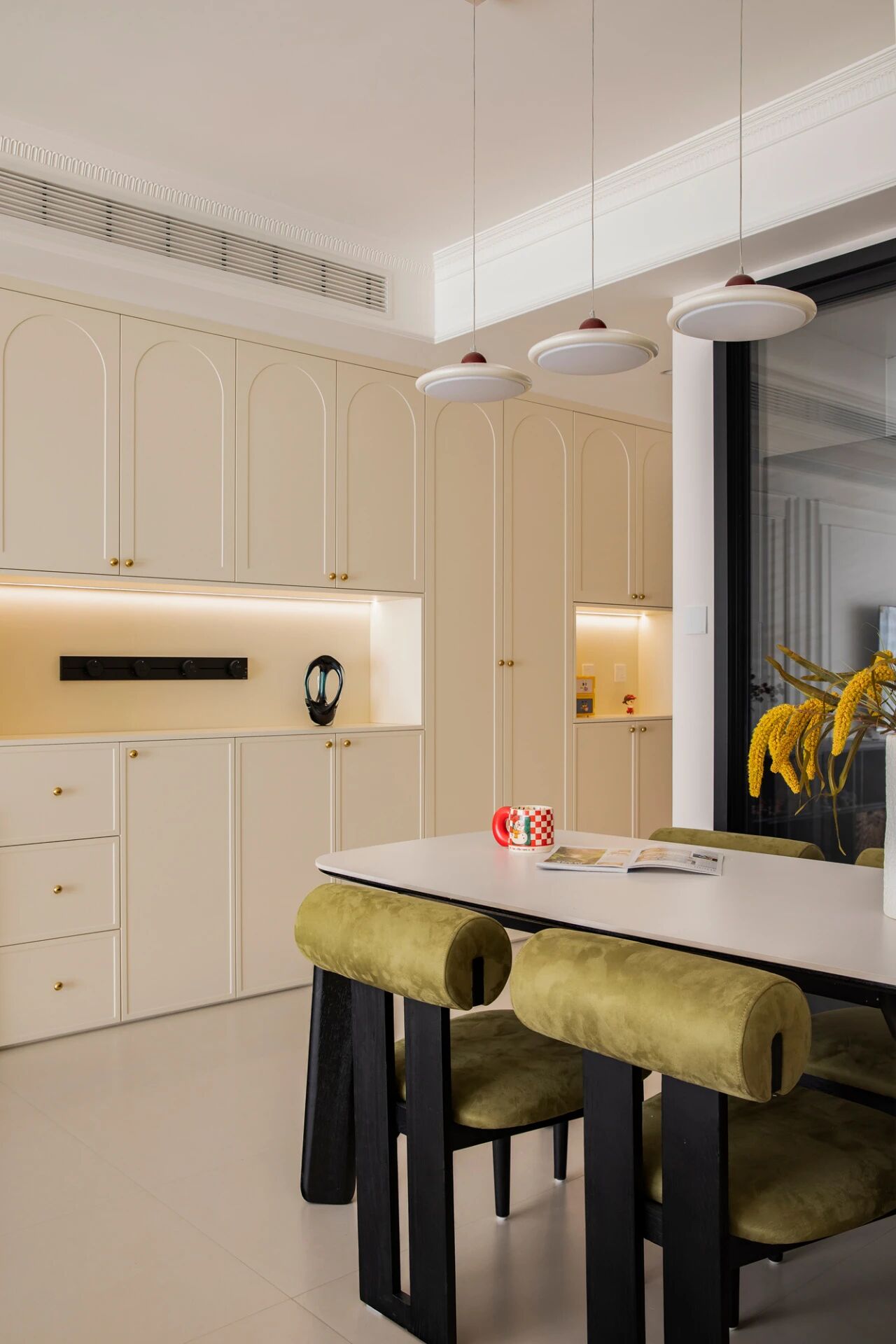 玄关柜与餐边柜之间用两扇一门到顶的封闭式柜体作为软隔断,有效区分空间的同时也增加收纳容量。