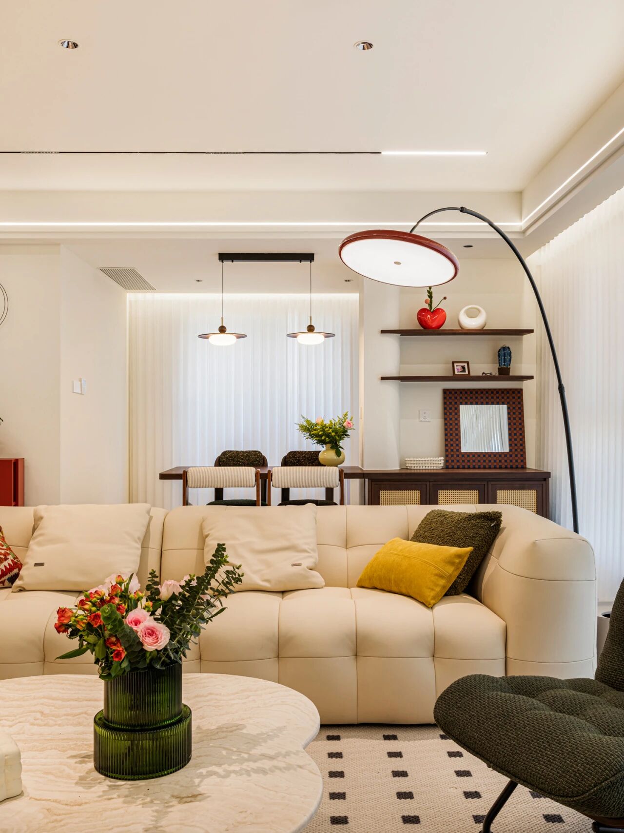 在下面这个案例中,利用墙体的拐角做延伸式转角柜,边角处做弧面柔化处理,空间利用率更高,整体的视觉效果看上去也更流畅。
