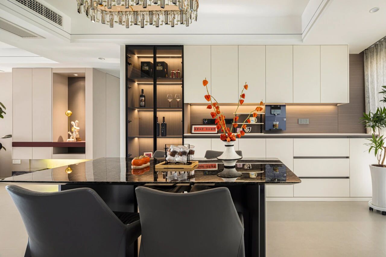 或者选择一部分空间做开放柜or加装玻璃柜门。另外建议大家可以给中间部分加装一条灯带,空间层次感和氛围感会更强,质感更显高级。