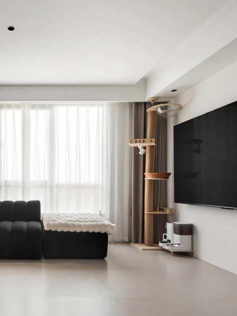 客厅角落 动静皆宜的陪伴区 客厅是人与宠物互动最频繁的区域,选择一处靠墙但不偏僻的角落,用来安置狗窝或猫爬架再合适不过。 这个位置既能让宠物拥有属于自己的领地感,又不至于脱离家庭生活的中心,它们可以安静地窝着,也能随时“监视”到人类动向,对宠物来说非常友好。