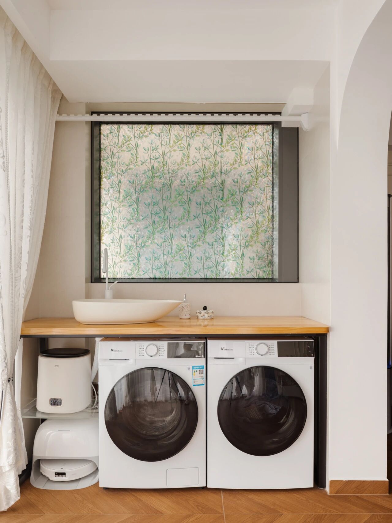 一侧放洗烘套装,不用晾晒解救阳台颜值。