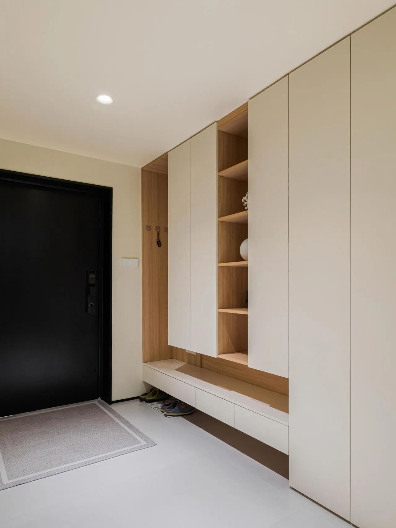 可以做定制玄关柜,这样一来鞋柜、挂衣区、台面都有了,还可以搭配一个换鞋座,不用弯腰扶墙也能轻松进出门。